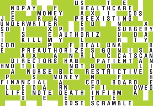 PIECE Studio created a word puzzle, in 2009, of problems associated with healthcare insurance in the United States. The word puzzle was placed inside medical library books and left at Baltimore hospital waiting rooms.